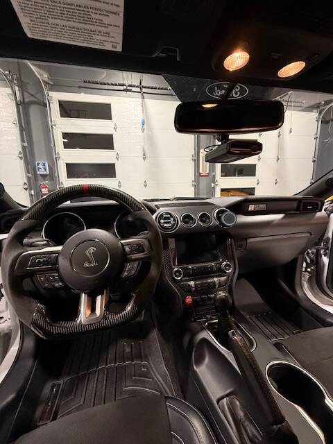 VMP Gen3R supercharger, twin 65 FRP TB, Fore fuel system, ID 1300x fuel injectors, Stainless Works long tube headers, Competition NSR Cams, new timing chains and sprockets, Bob's Catch can, Mcleod RXT 1200 clutch, MGW shifter with flat stick, Flaming River steering shaft, 3.73 gears, Shelby Wilwood front and rear conversion kit, JLT 148 mm CAI, UPR suspension, Eibach Pro Street lowering springs, HRE 3 piece wheels, Shelby 1000 hood, Lots of carbon fiber, Shelby upgraded speakers